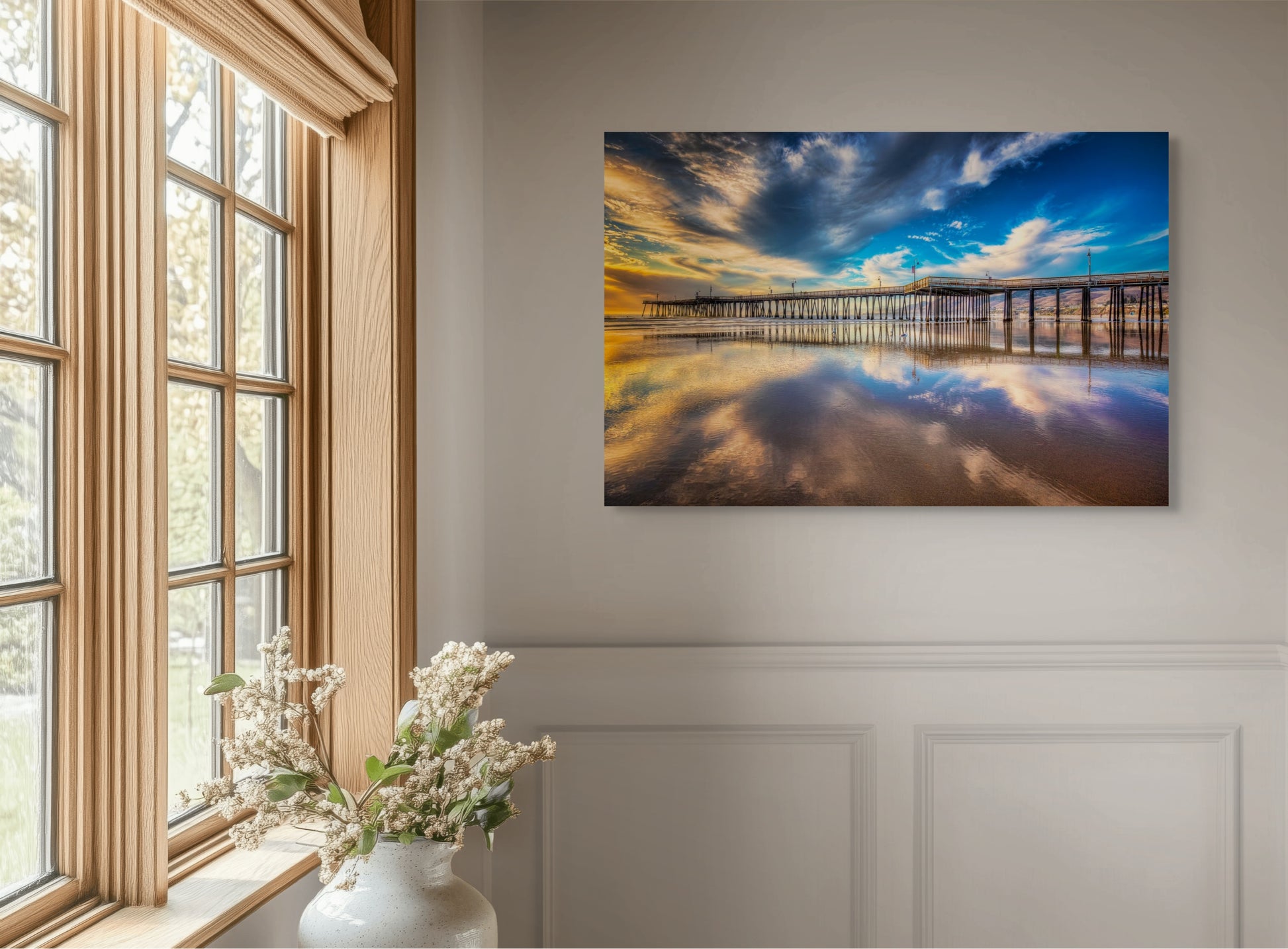 Another colorful sunset down at the Pismo Pier in Pismo Beach, California. The flat beach allows for great reflections at low tide. This photo was taken one year after the new Pismo Pier was built